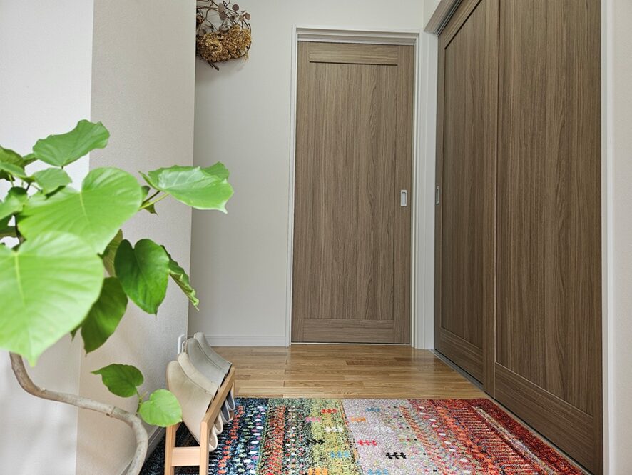 広い玄関を入ると猫の絵やドライフラワー、観葉植物が飾ってあり、